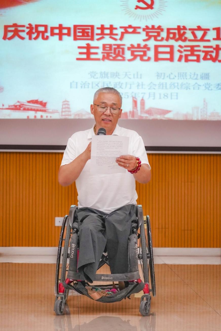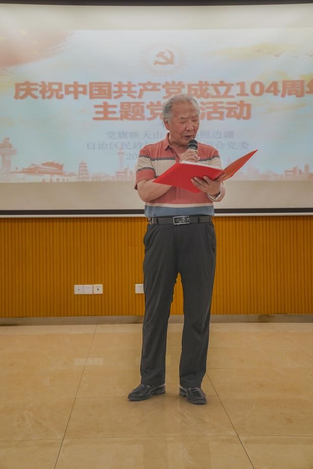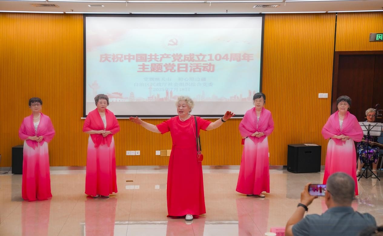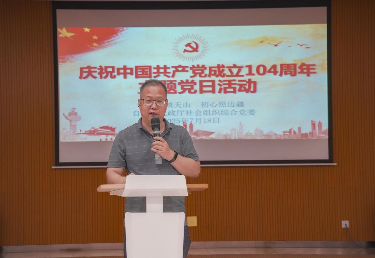 七月的天山瓜果飘香,七月的新疆党旗高扬。2025年7月18日,自治区民政厅社会组织综合党委在自治区图书馆举办“党旗映天山 初心照边疆”庆祝中国共产党成立104周年主题党日活动。通过高唱国歌、重温入党誓词,学习先进典型、共话初心使命等丰富多彩的形式,凝聚起所辖党员奋进新征程的磅礴力量。