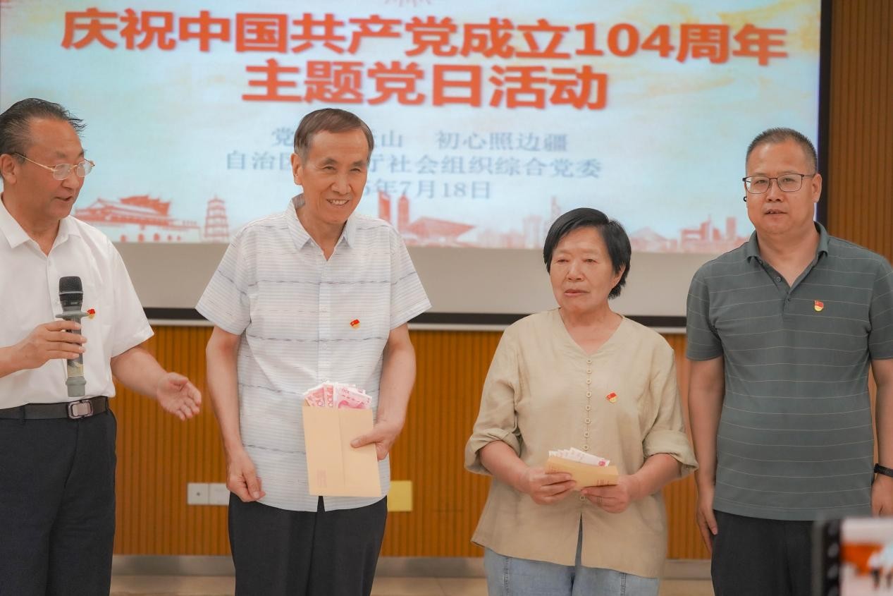 心声分享聚共识,关怀温暖老党员。心中有党,照亮实践道路;心中有爱,激发奋进力量。新疆残疾人驾驶员协会赵淑洪书记介绍说“党的百年成就波澜壮阔,作为党员,我们要以实干践行初心……”赵淑洪书记还激情的朗诵了诗词《诗颂风华》,歌颂了建党一百年来我党取得的伟大成就。党员代表围绕建党104 周年伟大成就及中央八项规定精神交流研讨,结合自身工作分享感悟,将理论学习与实践思考深度融合,展现出社会组织党员的责任担当。综合党委代表唐跃峰同志还向老干部发展促进会党支部老党员鲁仲举、锅炉(电采暖)行业协会党支部老党员2名受表彰老党员发放了慰问金。致敬他们初心不改、余热生辉的坚守,传递党组织对老党员的深切关怀与崇高敬意。