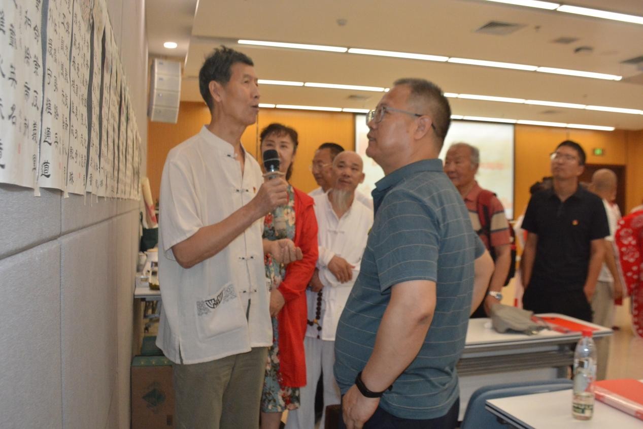 与会人员共同观看老党员李振国创作的93幅诗画楹联作品展览