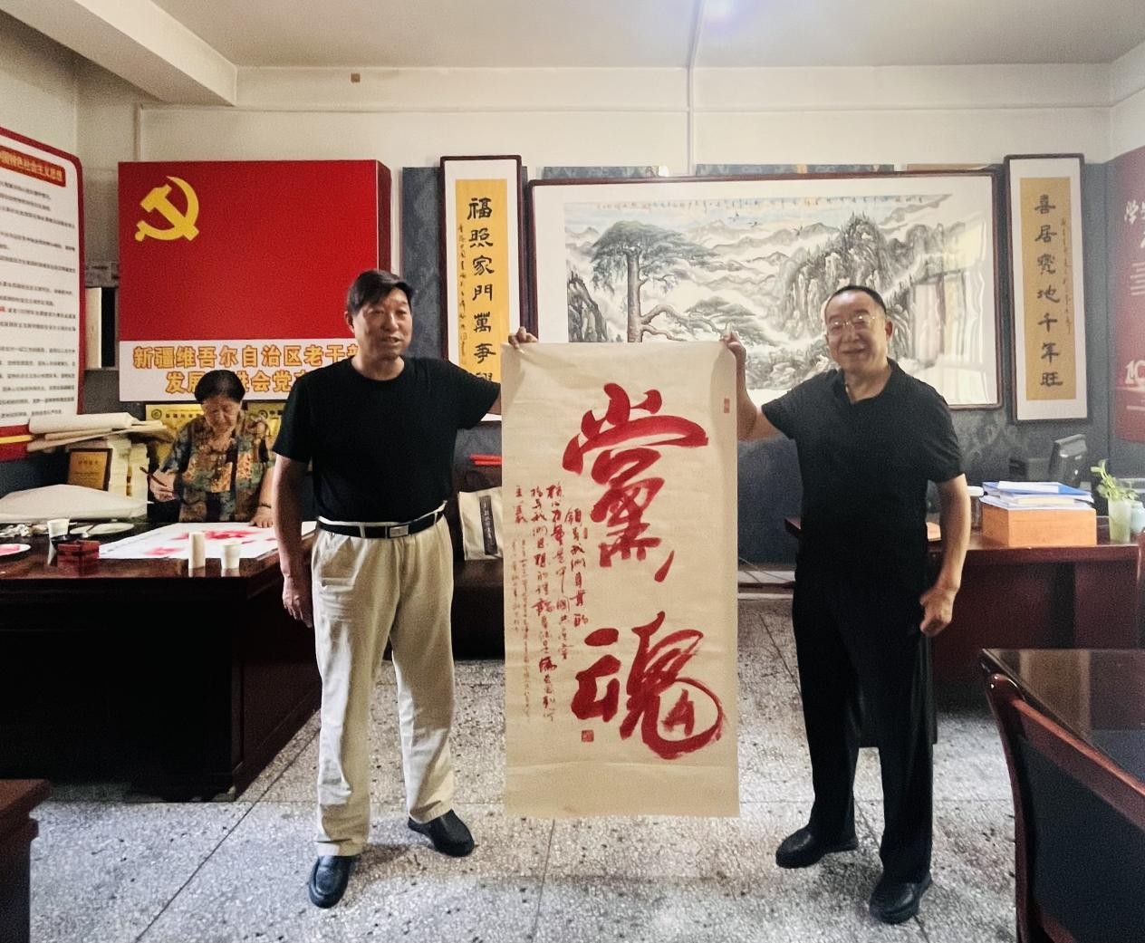老干部发展促进会红星书画院院长杨克俭赠送朱砂书法作品《党魂》和人民公园书画院院长汪广才共同向大家展示作品